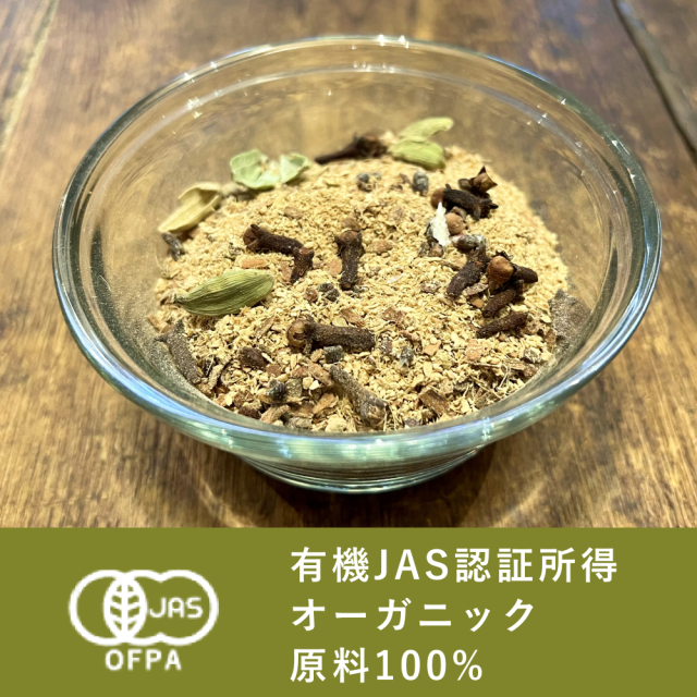 原材料名:有機ショウガ(インド産)、有機シナモン(スリランカ産)、有機カルダモン、有機クローブ