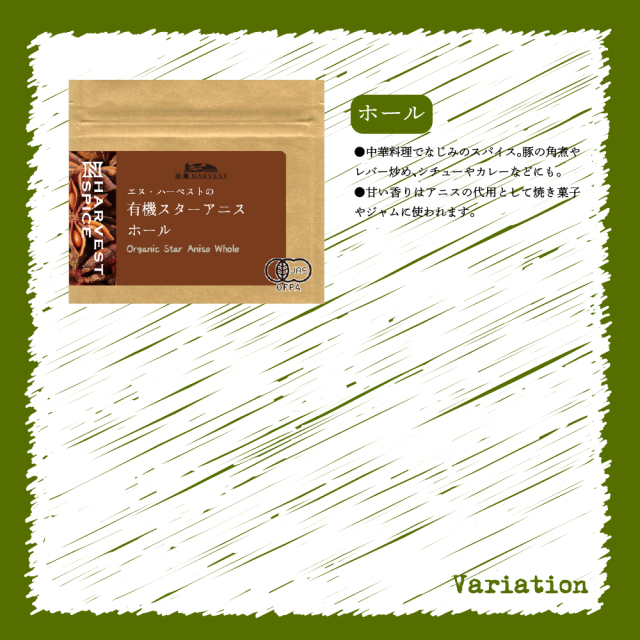 中華料理では八角と呼ばれ、豚肉や鶏肉、川魚の臭み取りに広く使われます。パウダー状のものは五香粉の材料のひとつになります。料理としては豚の角煮やレバー炒め、シチューやカレーなどにも合います。