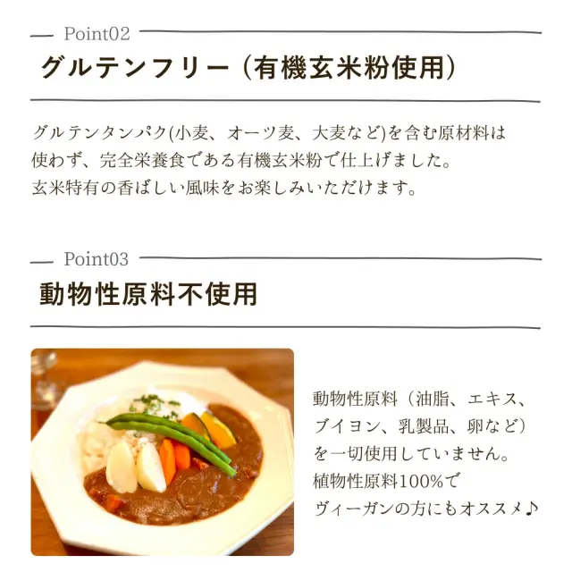 原材料:有機玄米粉(国内製造)、有機パーム油、有機砂糖、有機トマトパウダー、食塩、有機玄米味噌、有機ハヤシスパイス、有機ココア、りんごペースト1/7、有機アジュワイン